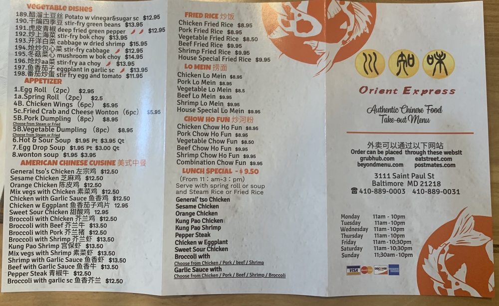 Located in Baltimore, MD, Orient Express is a sushi bar that offers a variety of dining options, including delivery, takeout, and reservations. This casual yet classy establishment provides a range of vegetarian dishes and accepts credit cards and Apple Pay. The menu features appetizers like spring rolls, shrimp toast, and BBQ spare ribs, as well as lunch combinations such as chicken with cashew nuts and vegetarian bean curd. Their soups, like hot and sour soup and tofu soup with vegetables, are flavorful and satisfying. With outdoor seating, TV, Wi-Fi, and alcohol options, Orient Express is perfect for groups, families, or a casual night out. The food here is delicious, and the ambiance is welcoming, making it a must-visit spot for sushi lovers in the area.